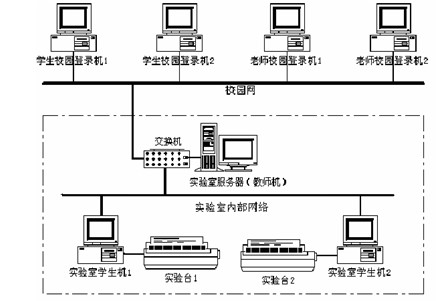 實(shí)驗(yàn)室內(nèi)部網(wǎng)采用星型結(jié)構(gòu),實(shí)驗(yàn)室服務(wù)器由教師端計(jì)算機(jī)擔(dān)任,實(shí)驗(yàn)數(shù)據(jù)采集由學(xué)生端計(jì)算機(jī)執(zhí)行。