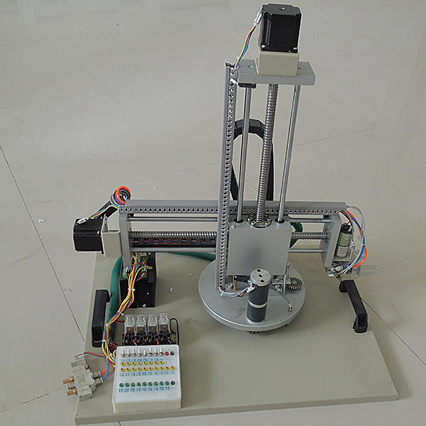 電氣方面由步進(jìn)電機(jī)、步進(jìn)電機(jī)驅(qū)動(dòng)模塊、傳感器、光電編碼器, 電磁閥、帶有位控功能的 PLC 主機(jī)等部件組成,能完成料 塊的碼放、移動(dòng)等功能, 可由學(xué)生自行完成該裝置各部件的組裝、接線、軟件編程、調(diào)整等訓(xùn)練,可實(shí)現(xiàn)機(jī)械手五維控制, 完成料塊的碼放、移動(dòng)等。