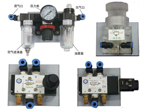 空氣過(guò)濾、減壓、油霧器三聯(lián)件,減壓閥,手動(dòng)換向閥,電磁換向閥,氣控?fù)Q向閥,行程閥,單向閥,節(jié)流閥、單向節(jié)流閥、快速排氣閥,或門(mén) 型梭閥,單作用氣缸,雙作用氣缸、旋轉(zhuǎn)氣缸,行程開(kāi)關(guān)(常閉、常開(kāi))等。