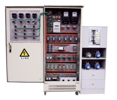 該裝置按標(biāo)準(zhǔn)電氣控制柜設(shè)計(jì)制造規(guī)格,充分利用雙面位置,柜內(nèi)裝有完成各種照明電路所需的單相電度表、日光燈、單聯(lián)開(kāi)關(guān)、插座、感應(yīng)開(kāi)關(guān)、漏電開(kāi)關(guān)等,以及電氣控制所需要的多種低壓電器,如漏電斷路器、熔斷器、電流互感器、交流接觸器、時(shí)間繼電器、熱繼電器、中間繼電器、行程開(kāi)關(guān)、按鈕、信號(hào)燈、轉(zhuǎn)換開(kāi)關(guān)、電壓表、電流表、功率表及電度表等,為了延長(zhǎng)電器使用壽命,各電器的接點(diǎn)都與接線端子相連,再由接線端子與被控制電氣連接。