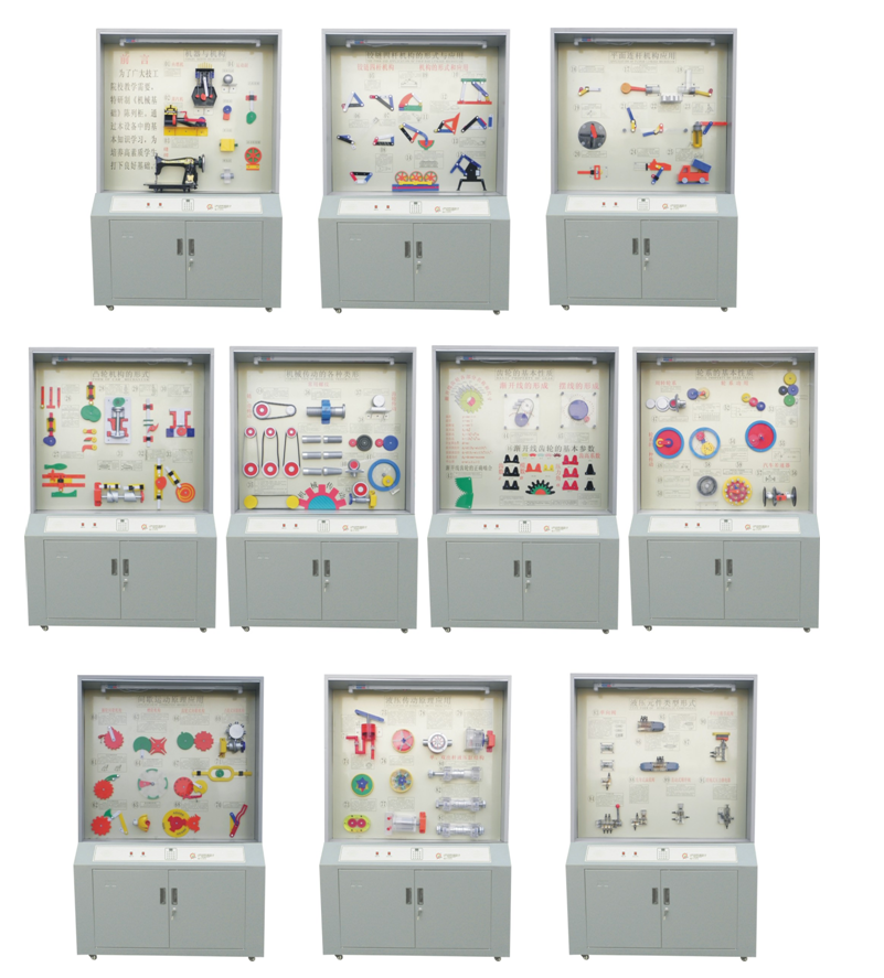 根據(jù)全國技工學(xué)校機(jī)械類通用教材《機(jī)械基礎(chǔ)》示教陳列柜是一套電化教學(xué)設(shè)備。本陳列柜共分十個柜,陳列柜通過機(jī)械模型或?qū)嵨?,配合相?yīng)的圖文資料,形象地展示與解說機(jī)械基礎(chǔ)的基本知識,加強學(xué)生對通用機(jī)械基礎(chǔ)的類型、結(jié)構(gòu)特點及其設(shè)計的感性認(rèn)知,為進(jìn)一步學(xué)習(xí)機(jī)械基礎(chǔ)奠定基礎(chǔ)。