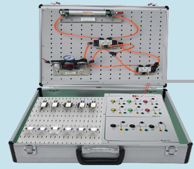 本氣動實訓箱主要由鋁合金機箱、各種小型標準工業(yè)氣動元件、電氣控制部分、等組成,結(jié)構(gòu)緊湊、輕便實用。學生可自主搭接氣動回路和電氣控制回路。能開設氣動元件和電氣元件的識別、壓力控制回路、方向控制回路、速度控制回路、順序動作回路等實訓項目??蓭нM教室作演示實驗,適合職業(yè)院校液壓與氣動傳動技術(shù)等課程的實訓教學需要.