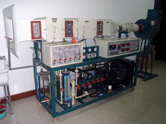 主要配置:可視測試風(fēng)洞,引風(fēng)機(jī),自動調(diào)節(jié)風(fēng)門,制冷壓縮機(jī),風(fēng)冷冷凝器,鈦包蒸發(fā)器,儲液罐,水冷冷凝器,冷凝—蒸發(fā)可互換表冷器,熱水加熱及冷水表冷器,不銹鋼蒸汽加濕鍋爐,可改變制冷、制熱的電磁閥組,溫濕度測試及水流量、風(fēng)流量測試用16路萬能信號輸入液晶漢化顯示巡檢儀顯示,溫濕度由A級Pt100(0.1℃)鉑薄膜熱電阻測量,水流量及風(fēng)流量測試用差壓傳感器測量,II型增加帶標(biāo)準(zhǔn)信號的多路萬能信號輸入巡檢儀,增加帶標(biāo)準(zhǔn)信號的數(shù)顯電流表電壓表,增加文丘里流量計配差壓傳感器測流量,增加調(diào)頻裝置調(diào)節(jié)壓縮機(jī)功率,軟件等。