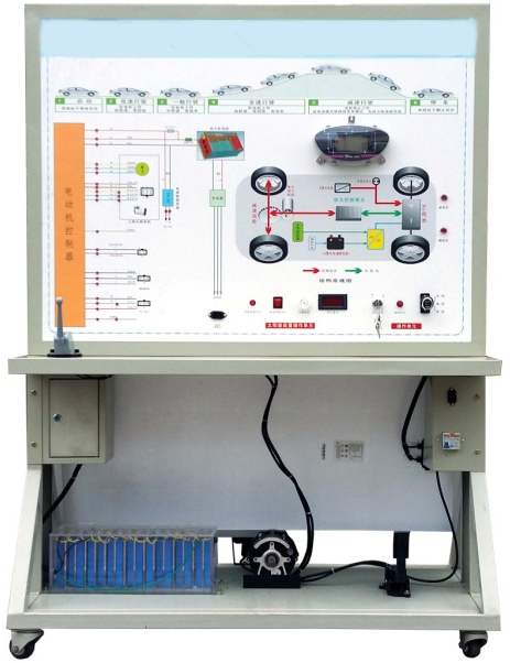 3、面板上安裝有點火開關(guān)、工況開關(guān)、油門踏板、擋位開關(guān)、制動開關(guān)、轉(zhuǎn)速表、電流指示表、太陽能裝置等,裝有一臺電機用來演示電動機的工作狀態(tài),及安裝太陽能充電板演示太陽能充電工況。